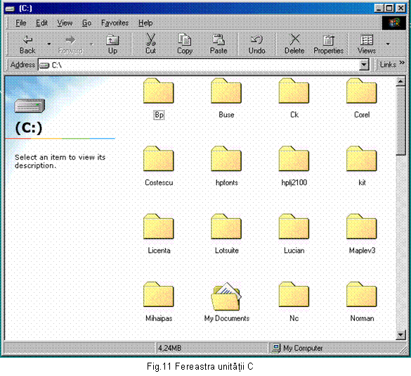 selectati Start, Programs, Windows Explorer sau efectuati un clic cu butonul din dreapta pe butonul Start si apoi selectati optiunea Explore sau efectuati un dublu clic pe icon-ul lui Windows Explorer din desktop si se va deschide o fereastra Exploring (a unitatii C ca în figura 12, care va afisa într-o structura arborescenta toate directoarele (All Folders) de pa unitatea C, apoi numele fisierelor din directoare, marimea tipul, data. Daca un icon al directorului este marcat cu semnul + în partea stânga a directorului, înseamna ca directorul mai contine si alte subdirectoare si pentru a le vedea efectuati un clic pe semnul +, iar semnul + se va transforma în semnul -, înseamna ca directorul respectiv nu mai contine si alte subdirectoare, apoi pentru a strânge icon-ul si a-i ascunde nivelele inferioare, efectuati un clic pe semnul -.