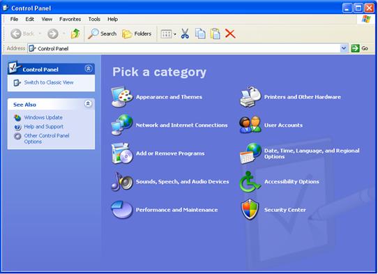 Panou de control (Control Panel) - prin care se poate alege modul de vizualizare dorit pentru pictogramele din dreapta (dupa categorii sau clasic);