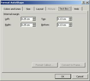 n Text Box Caseta text). Permite stabilirea distantelor care trebuie lasate între marginea formei si textul din forma.