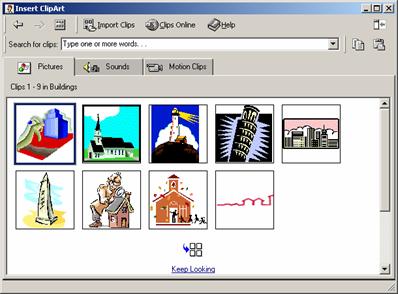 n Va aparea o colectie de imagini ClipArt pentru categoria selectata. Executa clic pe imaginea pe care vrei sa o folosesti sau, daca nu gasesti ceva sa-ti convina, apasa combinatia Alt + Home ca sa revii la lista de categorii.