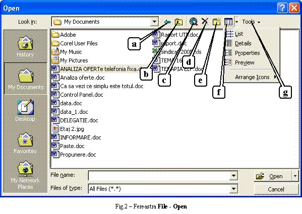 Up one level (b) schimba folderul curent din Look in cu folderul parinte al acestuia. Pentru pozitionarea în folderul unde se afla documentul ce urmeaza a fi deschis exista mai multe posibilitati: