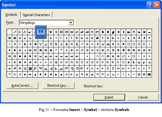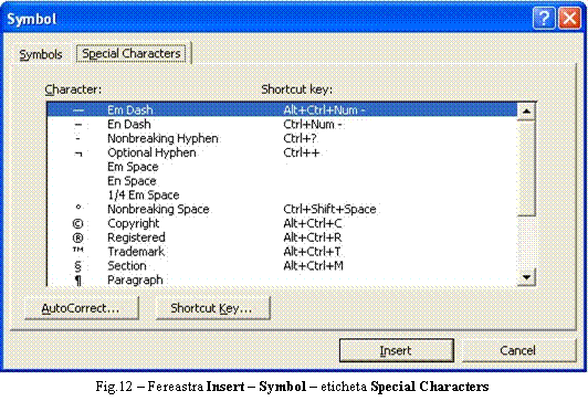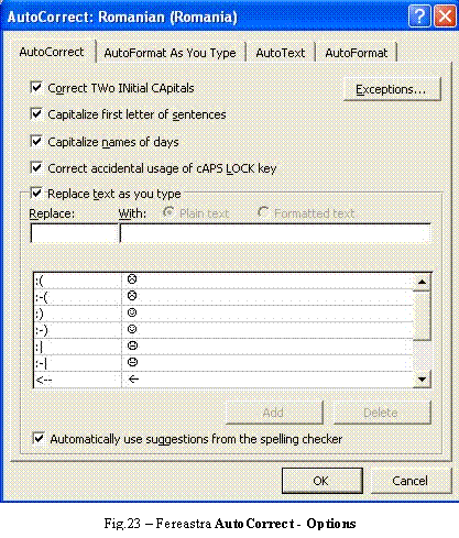 Afisarea casetei de dialog AutoCorrect se realizeaza prin selectia optiunii cu acelasi nume din meniul Tools care genereaza caset ade dialog afisata în Fig.23