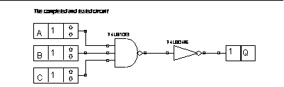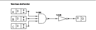 Now choose Save from the File menu. Since the circuit does not have a name yet, the computer will prompt you to name the circuit. Name it, then you can quit and take a break. Congratulations! You have built a 3-input And function, similar to the 74LS11.