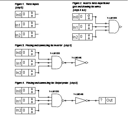 The LS library should be the active library. If it isn't then choose it from the Library menu. If it isn't in the Library menu, then load it from the disk. Choose the 'LS10/3 3-input Nand from the device library. Place the nand gate to the right of the three input ports. See figure 2.