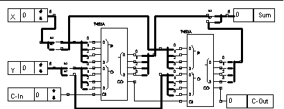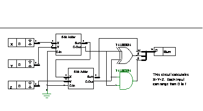 This tutorial will help you learn how to use buses (grouped wires), user-defined subcircuits, the trace window, and command files. The final circuit will be capable of calculating X+Y+Z, where X, Y, and Z can range from 0 to FF in hexadecimal (255 in decimal).