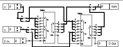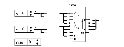 The 7483 A chip, a 4-bit adder, is found in the Standard library. If the Standard library is not the active device library, then choose the Standard library from the Library menu. The bus connectors hooked to X and Y are both 1-line to 2-line bus connectors. The bus connectors connected to the left of the 7483A are 1-line to 4-line, and the bus-connector connected to the right of the 7483A is a 4-line to 1-line.