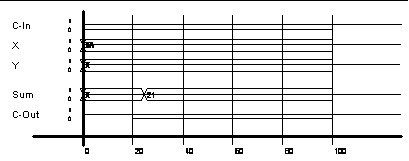 After you've tested the adder, choose Show Trace from the Windows menu (Output menu on the PC) to see the timing diagram. The following diagram is a sample trace. Notice that it takes 27 ns for the sum to appear. You can click in the Timing diagram to see the time at any point.