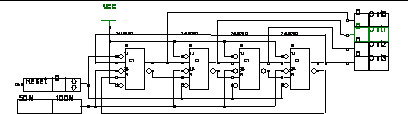 It is a 4-bit ring counter. The components used are High Voltage (Vcc), 1-bit input, clock, 74LS76 JK flip flop, and the output probe. The 74LS76 flip flop is found in the LS library under the name 'LS76/2 JK Neg Edge Trig FF.