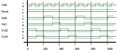 Choose Simulation Options again from the Simulate Menu, but this time set the initial conditions to Resistive High. Then close the Simulation Options dialog, reset the simulation time, set the Reset input to high, and run the simulation again. This time, notice that the simulation starts with all of the outputs at 1, and then goes to all of the outputs at 0, and stays that way until the reset input is set to 0.
