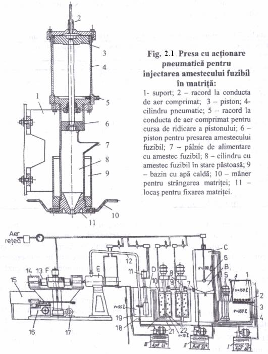 Realizarea modelului se face prin turnarea/ injectarea materialului fuzibil. Realizarea modelului prin turnarea masei fuzibile in stare lichida, desi se face la presiune mica si asigura o umplere usoara a matritei, nu are o aplicare larga din cauza procentului mare de modele rebutate datorita retasurilor ce se formeaza in modele (contractia amestecului de model creste cu temperatura). Modelel de buna calitate se pot obtine prin injectarea si preasarea amestecului fuzibil, in stare pastoasa, in matrite; astfel nu se formeaza retasuri iar contactia liniara este mica. Pentru realizarea modelelor, din amestec in stare pastoasa, se pot utiliza prese mecanice cu un grad mai mic sau mai mare de mecanizare. Schema unei prese cu actionare pneumatica este prezentata in Fig. 2.1.