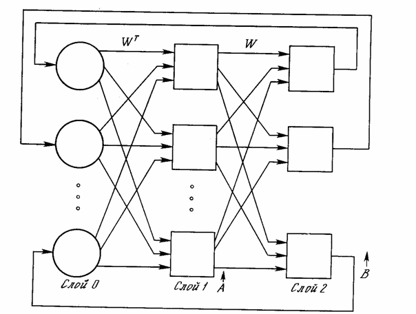 W и Wt Каждый образ состоит из двух векторов: вектора A, являющегося выходом слоя 1, и вектора B, ассоциированного образа, являющегося выходом слоя A A B B воздействует через транспонированную матрицу Wt A