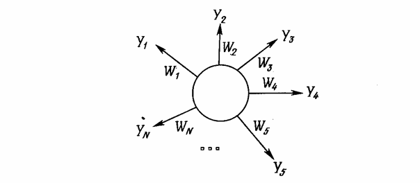 Много общих идей, используемых в искусственных нейронных сетях, прослеживаются в работах Гроссберга; в качестве примера можно указать конфигурации входных и выходных звезд [I], используемые во многих сетевых парадигмах. Входная звезда, как показано на рис. Б.1, состоит из нейрона, на который подается группа входов через синапсические веса. Выходная звезда, показанная на рис. Б.2, является нейроном, управляющим группой весов. Входные и выходные звезды могут быть взаимно соединены в сети любой сложности; Гроссберг рассматривает их как модель определенных биологических функций. Вид звезды определяет ее название, однако звезды обычно изображаются в сети иначе.