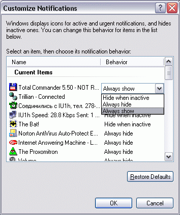 Речь l 434c221e 0;дет о той части экрана, где расположены системные часы и иконки различных программ. В WinXP появилась встроенная функция управления этой панелью. Теперь вы можете выбрать какие программы отображать, а какие скрывать в зависимости от активности или совсем. Чтобы получить доступ к управлению иконками в просто щелкните там правой кнопкой мыши на свободном месте и выберите Свойства. Сразу же можно определиться нужно ли вам созерцать системные часы и желаете ли вы скрывать иконки неактивных приложений. Для более детальной настройки нажмите кнопку Изменить.