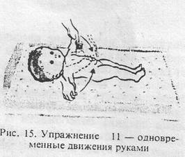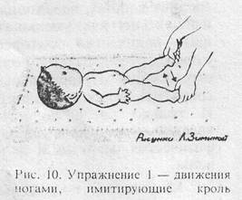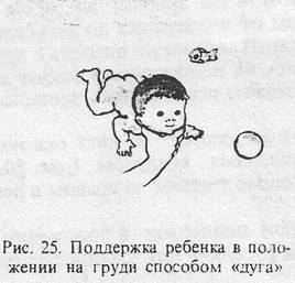 3 секунды, потом на 5-6 секунд, на 10-15 и т.д., доходя до нескольких минут. Помогает и такой прием: поддерживая малыша левой рукой под живот, учитель своей правой рукой быстро погружает его под воду (конечно, при условии, что ребенок уже был ранее хорошо обучен погружениям) до дна ванны и там дает ему полную свободу действий. В стремлении выбраться на поверхность ребенок может начать активные движения ногами или руками. Если он не проявит активности, учитель немедленно помогает ему своей левой рукой всплыть наверх. При выполнении этого приема учитель должен соблюдать все условия погружений (см. стр.78 и 81).