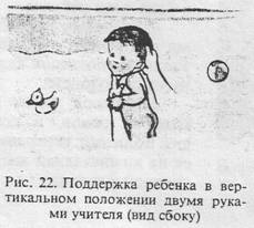 сидя на руке учителя) пли на седьмой (положение стоя с помощью рук учителя). В эти короткие промежутки времени на голову ребенка можно периодически поливать теплую воду, приучая его к задержке дыхания и стимулируя движения ногами. Вода поливается вначале из ладони учителя, потом из стакана, затем из губки и лейки, наконец