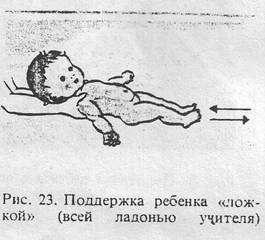 воздуха в ванной комнате); в изменении характера поддержки тела ребенка на поверхности воды, в переходе от активной поддержки (с помощью рук учителя) к пассивной (с помощью надувных резиновых изделий и других непотопля