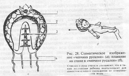 должен носить игровой характер, проходить живо и при постоянном общении учителя с ребенком. В первом периоде обучения важно, чтобы несколько занятии проводились при совместном погружении в воду учителя и Это предохранит ребенка от испуга.