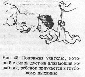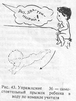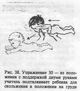 случаях, когда обычные упражнения (31-35) не дают успеха. Учитель находится в ванне и поддерживает ребенка способом «лицом к лицу». Перед глазами ребенка он погружает свою голову в воду (соскальзывая вниз и вытягивая вперед ноги), с шумом выдыхает в воду воздух, образуя пузырьки. Затем с улыбкой показывается над водой, приговаривая: «Хорошо! Делай так. Спрячь голову в воду». Если ребенок не хочет выполнять это, учитель принудительно погружает его лицо под воду. Упражнение повторяется 6-8 раз за урок.