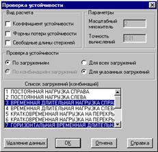 активизировать опции, определяющие вид данных, для которых выполняется проверка устойчивости: по загружениям или по комбинациям загружений, для всех загружений (комбинаций) или толь& 22222t1922w #1082;о для выбранных; в последнем случае выбор нужных данных выполняется в списке загружений (комбинаций).