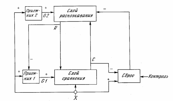 X G X X, равная единице, обеспечивает второй единичный вход, тем самым заставляя соответствующий нейрон слоя сравнения возбуждаться и устанавливая его выход в единицу. Таким образом, в этот момент времени вектор С идентичен вектору X.