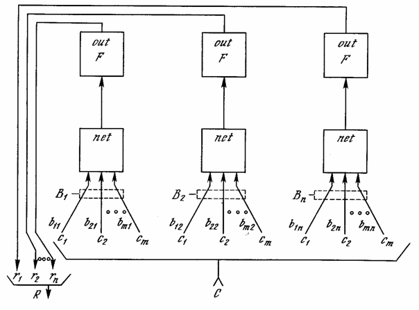 Сумма в знаменателе представляет собой количество единиц на выходе слоя сравнения. Эта величина может быть рассмотрена как «размер» этого вектора. В такой и 646p1519g 085;терпретации «большие» векторы С производят более маленькие величины весов bij