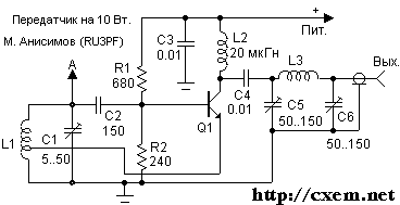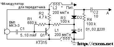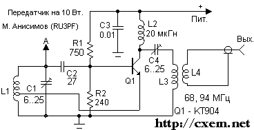 Выбирете одну из 2-х высокочастотных схем (в зависимости от приёмника) и соедините её с модулятором в точке А. Далее в качестве нагрузки подключите к антенне и общему проводу 2 лампы 6,3 В(0.22 А), соединённые последовательно. Подключите питание 5 В. Отключите контур L1, C1, вместо него подайте на вход сигнал с УКВ генератора. Проверьте волномером частоту выходного сигнала (если его нет или она не как с генератора - подстройте конденсаторы и катушки выходного контура). Далее соедините контур L1, C1 и повышайте напряжение питания. Дoлжна возникнуть автогенерация уже при 5 В (если не возникает - переместите эмиттер по катушке на 0.5...2 витка) - ток 250 мА. Не поднимайте напряжение выше 20В(ток 750 мА, мощность 8...10 Вт). Далее подстройте все контура, проверяя частоту по волномеру. При монтаже (навесном, прямо на радиаторе) выводы деталей должны быть как можно короче, использоваться конденсаторыс соответствующим ТКЕ, катушки должны быть плотно намотаны. Только тогда вы получите хорошую стабильность частоты, иначе она будет "плыть" до 500 Гц. Частотный модулятор насттраивают, подбирая R1, когда напряжение на коллекторе Q1 станет равны половине питающего. Так же может потребоваться поключение точки А к части витков L1. |