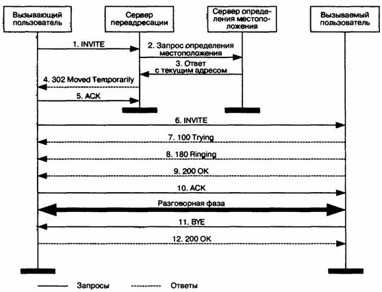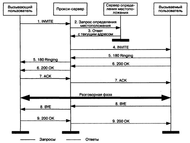 Алгоритм работы пользователей с прокси-сервером выглядит следующим образом. Поставщик услуг IP-телефонии сообщает адpec прокси-сервера своим пользователям. Вызывающий пользователь передает к прокси-серверу запрос соединения. Сервер обрабатывает запрос, определяет местоположение вызываемого пользователя и передает запрос этому пользователю, а затем получает от него ответ, подтверждающий успешную обработку запроса, и транслирует этот ответ пользователю, передавшему запрос. Прокси-сервер может модифи 313m128d цировать некоторые заголовки сообщений, которые он транслирует, причем каждый сервер, обработавший запрос в процессе его передачи от источника к приемнику, должен указать это в SIP-запросе для того, чтобы ответ на запрос вернулся по такому же пути.