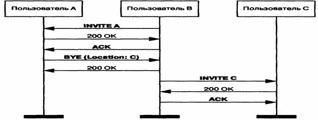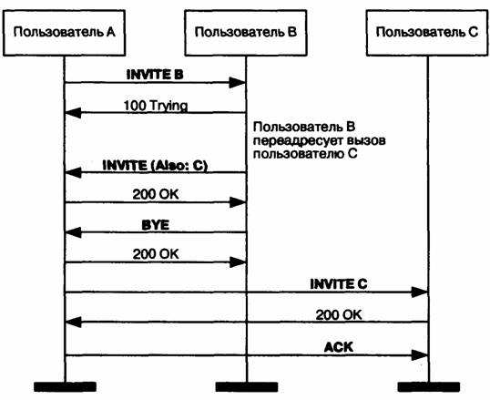 Дополнительная услуга «Переадресация вызова» позволяет пользователю назначить адрес, на который, при определенных условиях, следует направлять входящие к нему вызовы. Такими условиями могут быть занятость пользователя, отсутствие его ответа в течение заданного времени или и то, и другое; возможна также безусловная переадресация. Оборудование пользователя, заказавшего эту услугу, получив сообщение INVITE В, проверяет условия, в которых оно получено, и если условия требуют переадресации, передает сообщение INVITE с заголовком Also, указывая в нем адрес пользователя, к которому следует направить вызов. Терминал вызывающего пользователя, получив сообщение INVITE с таким заголовком, инициирует новый вызов по адресу, указанному в поле Also. В нашем случае пользователь А вызывает пользователя В, а терминал последнего переадресует вызов к пользователю С (Рисунок 7.12).