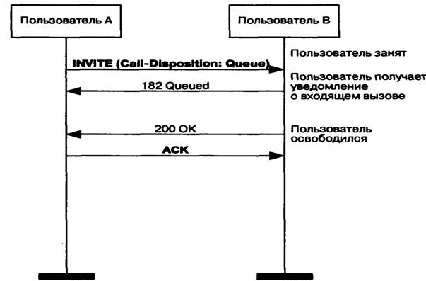 Услуга реализуется с помощью заголовка Call-Disposition, в котором содержится инструкция по обслуживанию вызова. Вызывающий пользователь передает запрос INVITE с заголовком Call-Disposition: Queue, который интерпретируется следующим образом: вызывающий пользователь хочет, чтобы вызов был поставлен в очередь, если вызываемый пользователь будет занят. Вызываемая сторона подтверждает исполнение запроса ответом 182 Queued, который может передаваться неоднократно в течение периода ожидания. Вызываемый пользователь получает уведомление о входящем вызове, а когда он освобождается, вызывающей стороне передается финальный ответ 200 ОК.