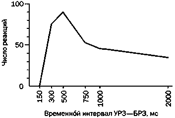 Важной переменной при выработке услов& 424e411e #1085;ых реакций является очередность следования сочетаемых раздражителей - потенциального УРЗ и БРЗ. УРЗ предшествует БРЗ в ситуации прямого обуслов& 424e411e #1083;ивания; воздействие УРЗ и БРЗ совпадает по времени в ситуации одновременного обуслов& 424e411e #1083;ивания; УРЗ следует за БРЗ в ситуации обратного обуслов& 424e411e #1083;ивания. Осн. масса данных свидетельствует о том, что в ситуациях одновременного или обратного обуслов& 424e411e #1083;ивания не происходит обуслов& 424e411e #1083;ивания в собственном смысле слов& 424e411e #1072;. Иногда эксперименты представляют нек-рые минимальные данные, указывающие на существование одновременного или обратного обуслов& 424e411e #1083;ивания, однако такие реакции не могут в действительности представлять собой обуслов& 424e411e #1083;енную реакцию в обычном значении этого термина. Прямое обуслов& 424e411e #1083;ивание, очевидно, происходит, но не как простая связь между УРЗ и БРЗ, подаваемых в разные моменты времени. Рисунок 1 иллюстрирует эту связь, представляющую собой обобщенные рез-ты многочисленных экспериментов, в к-рых использовались различные реакции, вырабатываемые у представителей разных биолог. видов. Обуслов& 424e411e #1083;ивания не происходит до тех пор, пока временной интервал между воздействием БРЗ и следующим за ним УРЗ не достигнет примерно 0,15 с, после чего эффективность обуслов& 424e411e #1083;ивания довольно резко нарастает, достигая своего максимального значения при временном интервале около 0,5 с, а затем начинает постепенно снижаться. Хотя данные экспериментов неск. различаются в оценках этого интервала, кривой, подобной приведенной на рис. 1 с максимумом в интервале 0,5 с или неск. меньше, достаточно для того, чтобы сделать следующий вывод: она отражает общие и принципиальные характеристики обуслов& 424e411e #1083;ивания, к-рые должны учитываться при любой теорет. интерпретации обуслов& 424e411e #1083;енной реакции.