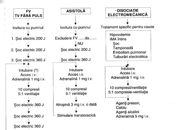 Schema terapeutica pentru FV/TV fara puls, asistolie si