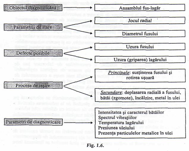 Stabilirea numarului total de parametri de diagnosticare ai unui sistem are loc pe baza unei scheme in care sunt figurate legaturile dintre sisiem si marimile fizice, cu ajutorul carora se pot face aprecieri cantitative asupra proceselor principale si auxiliare. Iata, de pilda, in cazul perechii fus- lagar (fig. 1.6), ales ca sistem structural, parametrii care caracterizeaza starea tehnica sunt jocul radial si diametrul fusului.