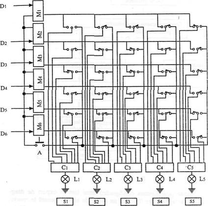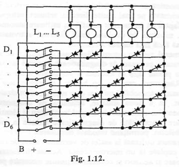 O alta posibilitate de modelare electrica a matricei o ofera folosirea diodelor, asa cum se exemplifica in figura 1.12. pentru un dispozitiv care functioneaza dupa principiul inmultirii logice, construit tot pe baza matricei de diagnosticare din tabelul 1,1, dupa urmatoarea schema logica: