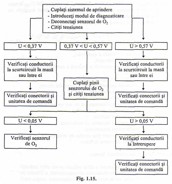 in acest scop se masoara tensiunea de iesire din senzorul de oxigen: daca ea este mai mica decat 0,37V sau mai mare decat O,57V, trebuie sa fie verificate cablurile. Daca tensiunea se incadreaza intre cele doua valori, trebuie sa se verifice daca defectul se situeaza la nivelul senzorului de oxigen sau la unitatea de comanda. Pentru aceasta se cupleaza conductorii ce vin de la sonda la intrarea in dispozitivul de comanda, simulandu-se un scurtcircuit al senzorului si se masoara din nou tensiunea.