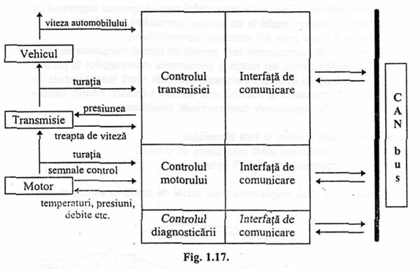 Componentelor care asigura functionarea dupa criterii de optimizare a sistemelor automobilului, li se alatura elementul de control al diagnosticarii. Pentru a vedea cum functioneaza o astfel de retea, se considera cazul mai simplu al grupului moto-propulsor prevazut cu trei subsisteme electronice separate: