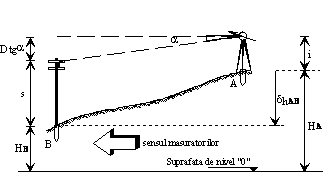 Dupa cum se observa, aparatul este asezat deasupra punctului A. naltimea "i" a instrumentului se masoara cu o ruleta.Relatiile de calcul devin :