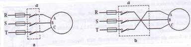 Montarea unui inversor de sens se face conform schemei redate in fig.1.20. Se poate constata ca in pozitia din fig 1.20.a. motorul este conectat direct (R cu A ,S cu B,T cu C)prin intermediul comutatorului a.Pentru inversare comutatorul inverseaza doua faze intre ele (R si T),in asa fel incat curentul va circula pe traseul R - C - B si T - A.