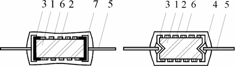 Structura constructiva prezentata īn figura 3.a corespunde rezistoarelor cu pelicula de carbon cu Pn [0,25;2] W. Cele cu puterea nominala de 0,125 W, au structura constructiva din figura 3.b, diferind doar prin zona de contactare si anume terminalul se sudeaza la un capacel de Ni(7), iar acesta la pelicula de Ni(3).