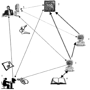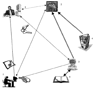 1 - Client, detinator al unui Certificat; 2 - Registrul Furnizorilor de Servicii de Certificare (RFSC) tinut de ARS; 3, 4 -- Furnizori de Servicii de Certificare (FSC2 gestioneaza cheia publica a FSC1); 5 - Destinatarul unui document semnat electronic; 6 - RC1- Registrul electronic de evidenta a certificatelor eliberate de catre FSC 1.