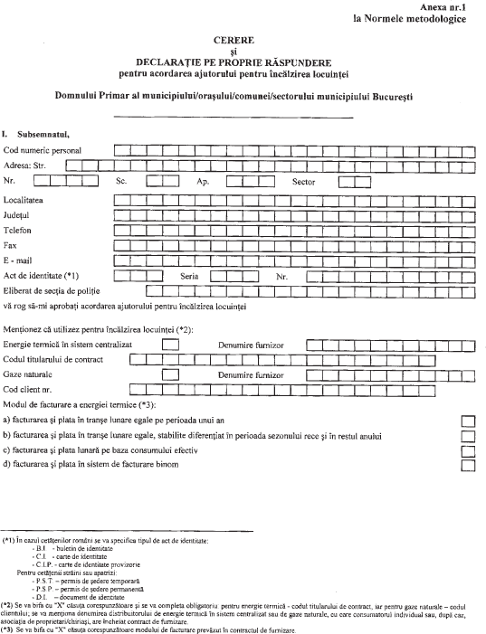 (3) Formularul continānd cererea si declaratia pe propria raspundere pentru acordarea ajutorului pentru īncalzirea locuintei se completeaza de catre persoanele care īndeplinesc conditiile de acordare a ajutorului pentru īncalzirea locuintei, potrivit modelului prevazut īn anexa nr. 1.