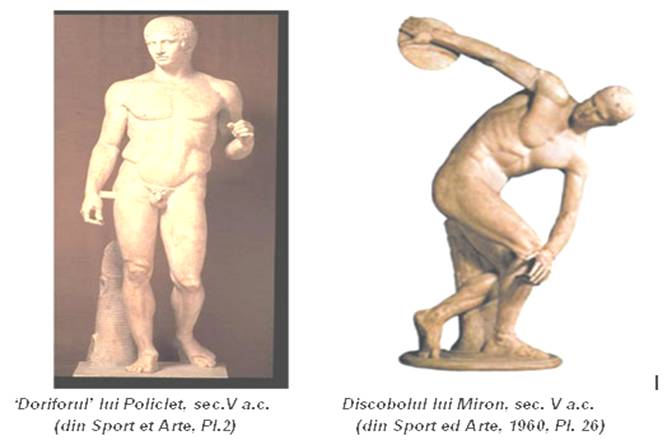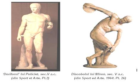 . Idealul de frumusete grecesc intemeiat pe un studiu atent al proportiilor si pe redarea miscarii si armoniei interioare este ilustrat mai ales de triada clasica de sculptori -;POLICLET, MYRON si FIDIAS.