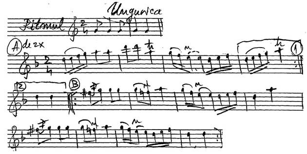 Pasii dansului influenteaza linia melodica, in sensul ca discursul sonor abunda in accente, formule sincopate si un numar simetric de pulsatii.