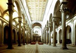 Printre cele mai cunoscute lucrari ale lui Brunelleschi se numara o serie de cladiri religioase. Prima comanda, începuta în 1419, i-a fost adresata de catre familia de Medici si reprezenta reconstructia bisericii San Lorenzo. Cererea a fost privita, cu siguranta, ca o provocare ce nu trebuia ratata: spatiul interior al unei cladiri de cult era cel mai potrivit loc pentru probarea cunostintele referitoare la relatia dintre frumusetea si echilibrul unui edificiu si raporturile existente între elementele componente ale acestuia, notiuni pe care Brunelleschi le acumulase la Roma. Interiorul unei biserici trebuie sa sugereze echilibru, seninatate; asa cum Dumnezeu guverneaza lumea cu multa întelegere, spatiul interior al cladirii de cult trebuie sa se supuna unor legi clare, lesne de înteles. Pentru Brunelleschi aceste legi care stau la baza monumentului religios sunt legile matematice.
