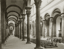 Navele sunt separate între ele prin arcade asemenea celor întrebuintate în bazilicile paleocrestine din Roma: arcele în plin cintru se descarca pe un fragment de arhitrava care se gaseste deasupra capitelului corintic. Partea superioara a navei centrale este înconjurata de un antablament pe care se sprijina ferestrele care lumineaza spatiul central al constructiei. Nava este acoperita cu un planseu casetat, neutru, tot de inspiratie paleocrestina. În zona colateralelor compozitia lui Brunelleschi prezinta unele neconcordante. Peretii exteriori ai navelor laterale sunt ritmati de pilastri angajati care suporta un antablament; înaltimea pilastrilor angajati este ceva mai mica decât cea a coloanelor care delimiteaza navele. Din acest motiv, arcele care separa traveile colateralelor între ele se descarca, spre centru, pe coloane, si spre extremitati, pe antablament.