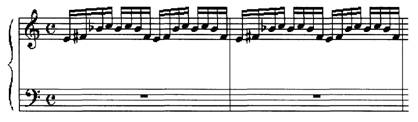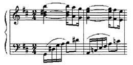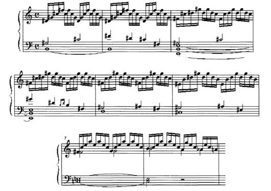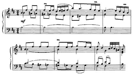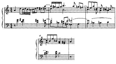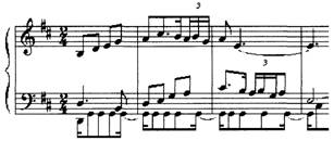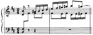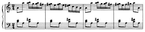 unui la minor doar sugerat, figuratia consecutiva realizandu-se pe tetratonia mi - re# - do# - la; de altfel, figuratia din prima fraza a B-ului mai poate fi considerata ca realizandu-se pe tricordia mi - re# - do# si fiind inclusa si pedala initiala pe LA, dubla de aceasta data