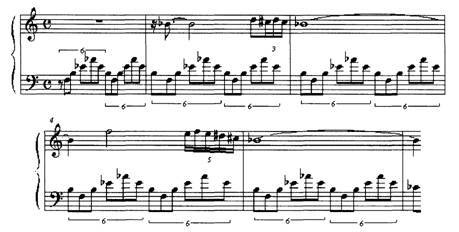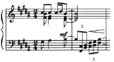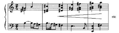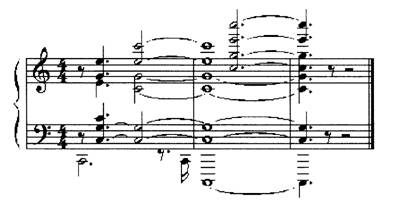Observam, asadar, ca de data aceasta compozitorul renunta la simultaneitatea sonoritatilor extreme, preferand decalajul lor in timp, poate pentru a le sublinia mai mult contrastul.
