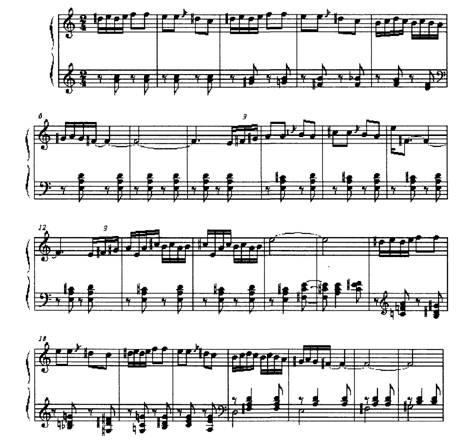ritmico-melodica ce se intinde pe doi timpi - are la baza un acord de cvarte care apare pe tot parcursul piesei in diverse rasturnari. Prima expunere tematica debuteaza cu salturi de cvarte consecutive in acelasi sens iar desfasurarea melodica dezvaluie o structura modala pentatonica
