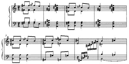 armonic se bazeaza pe ideea de pedala tripla si de ostinato armonic construit din acorduri de cvarte.