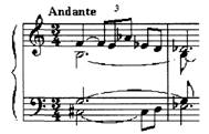 Andante-le ce precede reluarea primei expuneri tematice se desfasoara polifonic, aparent pe patru planuri sonore, din care cele mediane merg paralel si ocupa registrul mediu-grav, creand o atmosfera linistita, cu caracter narativ.