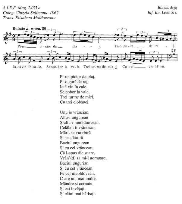 In ceea ce priveste cantecul propriu-zis pastoresc se intalnesc numeroase variante purtand textul "Brazi inalti si cetinati", "da-mi, Doamne, zile mai multe", "ciobanas de la miori".